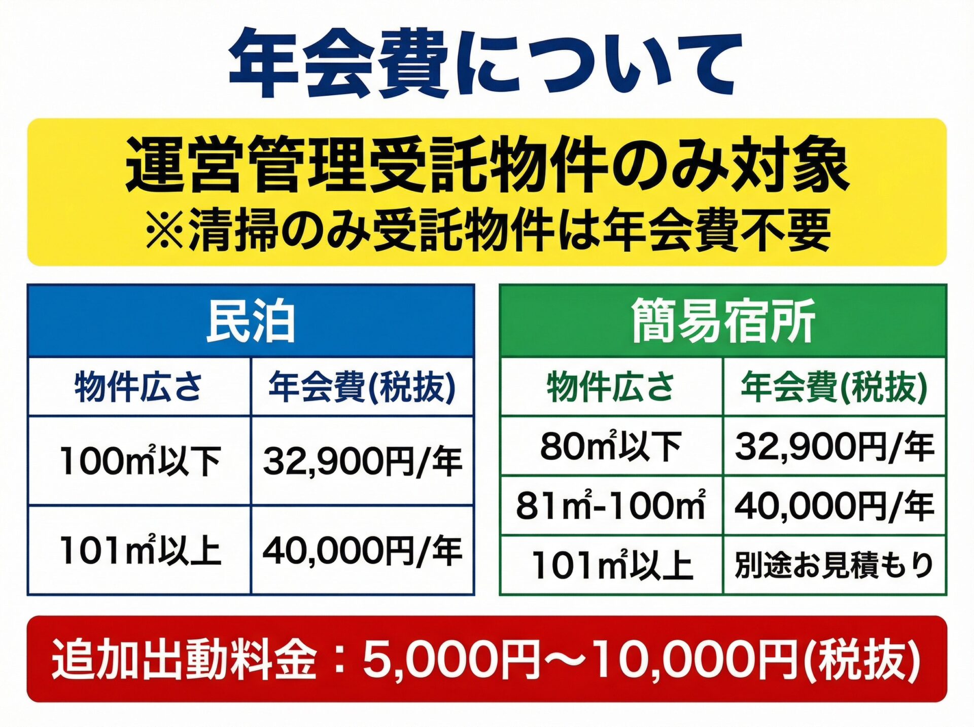 ※清掃のみ受託物件、または営業時間内のみの対応をご希望の場合は、年会費は発生いたしません。